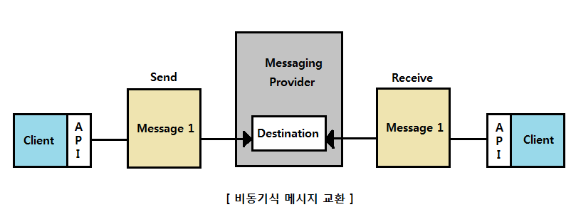 - 비동기(Asynchronous) : 데이터를 수신자에게 바로 보내지 않고 큐에 넣고 관리하기 때문에 나중에 처리 가능